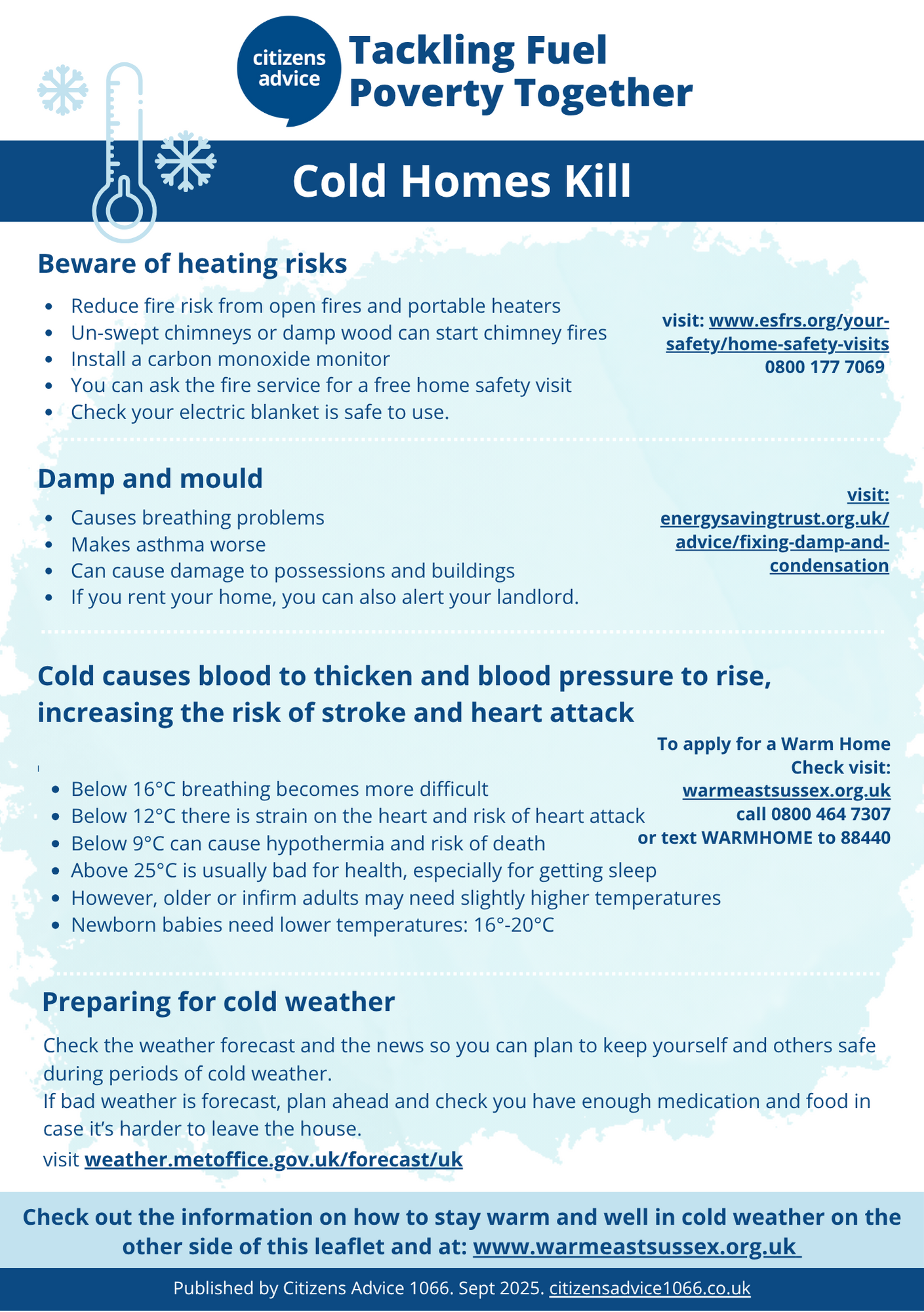See our Keep Warm and Well leaflet created in collaboration with the East Sussex Fuel Poverty Co-ordinator for information on the risks of living in a cold home and the support available to keep warm this winter.